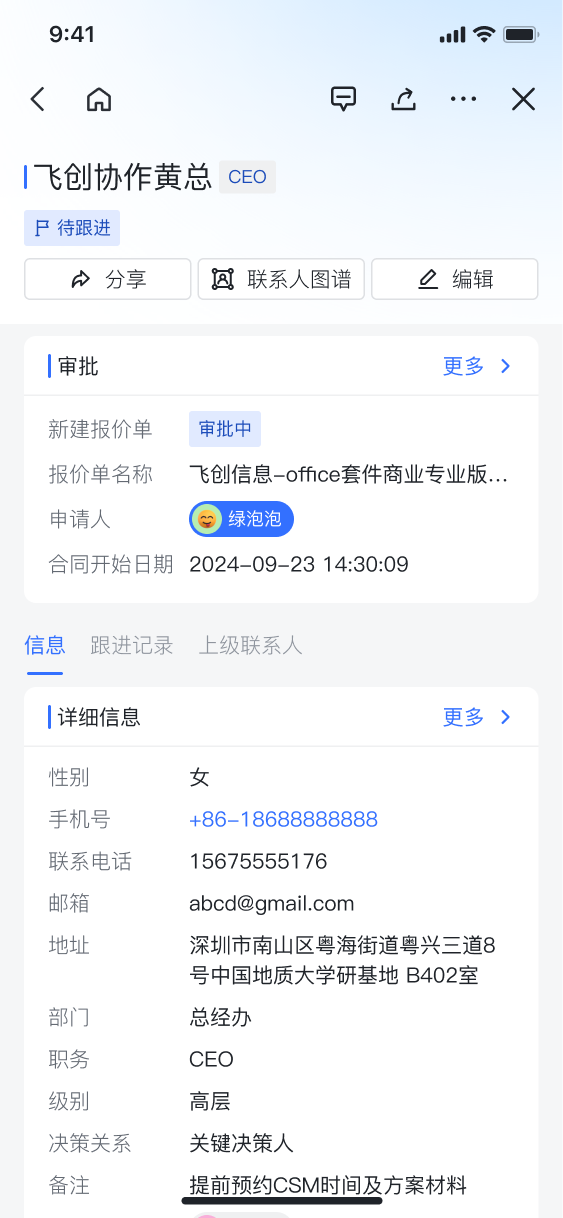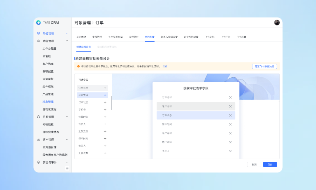 ![]() 飞创CRM 的自定义审批配置,支持您根据自身的业务需求和流程规范,自定义设置审批的条件、流程以及参与审批的人员等。通过这种精细化的配置,不仅能够有效提升工作效率,还能确保新建对象的准确性与合规性,从而为业务的顺利推进提供有力的保障。 ![]() 自定义审批配置自定义审批配置提供了更全面的定制化能力,管理者可个性化设定新建线索、客户、联系人、跟进记录、商机、报价单或合同等对象的审批流程字段。 例如,企业管理员完成新建联系人审批配置后,一旦销售人员创建联系人,便会自动触发联系人的审批流程,待审批人通过,联系人的创建便可成功。 同时,在相应的对象卡片页面,我们将审批模块前置化展示,使你能够清晰直观地了解审批进度。